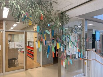 森村学園中等部・高等部では、現在校舎内の数か所に、色とりどりの願い事をたくさんぶら下げた笹が飾られています。設置したときは、どれくらいの生徒が短冊を書いてくれるかな…と少々弱気だったのですが、百数十枚用意した短冊は1日持たずに売り切れ。あわてて追加の短冊をどっさり作成しました。七夕の今日も、笹の前には人だかりが…「密」です! Social Distance!