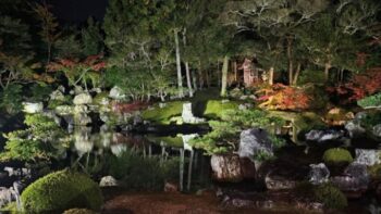 午後は、醍醐寺の特別拝観です。はじめに、森村の卒業生である住職による法話を拝聴しました。「奪い合うのか」「分かち合うのか」どういう生き方をしたいのか、考えてほしいとのお言葉、胸に染みました。その後、舞妓さんによる舞も鑑賞しました。鑑賞後には同年代の舞妓さんに次々と質問がでて、印象深い時間となりました。夕食後は、ライトアップされた三宝院庭園を拝観し、幻想的な雰囲気に浸りました。そして一路京都へ。