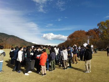 初日は鳴沢活き活き広場にて、「学年の絆を深める」という目標のもと、レクリエーションを実施しました。NPO法人富士山ネイチャークラブのスタッフの方々のご指導のもと、生徒たちはクラス混合チームを組み、クイズや、自然の中で生きていくための力を育むアクティビティ等に取り組みました。また、研修旅行スタッフの生徒が旅行前に企画した、互いの名前を呼びながら行う大縄跳びや、学年に関するクイズに正解すると仲間を助けられるケイドロなども行われました。1日を終え、就寝前に合宿のしおりに記入した振り返りでは、「知らない生徒と仲良くなれて楽しかった」「初めてだったけれど、気さくに話しかけてもらえて嬉しかった」といった感想が多数見られました。