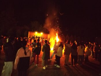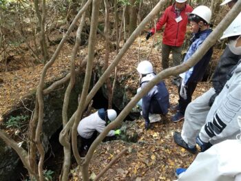 2日目は自然探究コース、風穴探究コース、科学探究コースの3つのコースに分かれて活動を行いました。中でも風穴探究コースでは、大小さまざまな風穴を探検しました。入口や出口が狭く、どうやって進むのかを工夫する必要のある風穴や、途中、匍匐前進しなければならない風穴もあり、それぞれの風穴を存分に楽しみました。活動後には、「楽しかった」「もっと色々な風穴に入ってみたい」といった声が聞かれました。夜にはキャンプファイヤーを行い、大きな火を囲みながら、研修旅行スタッフの生徒が企画した催しを皆で楽しみました。