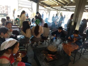 クラス別レクリエーションを終えた後は、ほうとう作りに挑戦しました。1日目と同じクラス混合チームで、麺と汁を協力して作り、片付けまで生徒たち自身で行いました。煙に苦労しながら作ったほうとうの味は格別で、「時間さえあればいくらでも食べられる」といった声も聞かれました。