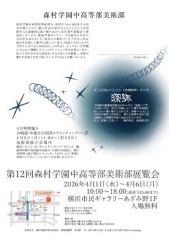 「第12回森村学園中高等部美術部展覧会」を4月1日(水)から4月6日(月)まで、横浜市民ギャラリーあざみ野にて開催いたします。中高合わせて48名の部員たちが1年間制作してきた約100点の個人作品と、会場に合わせて共同制作するインスタレーション作品を展示します。