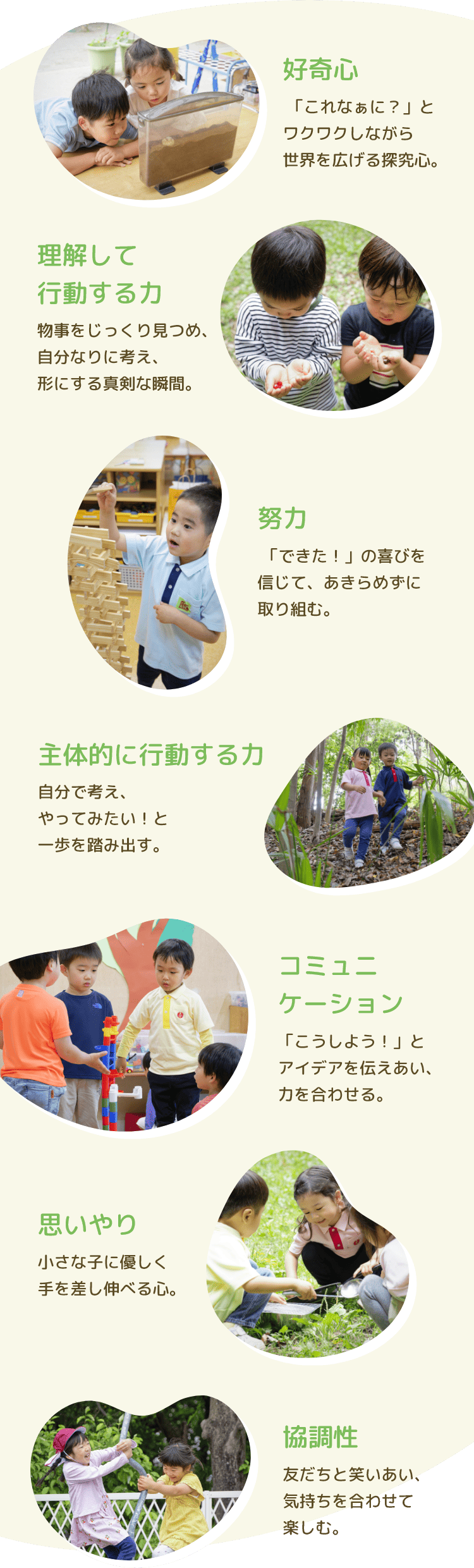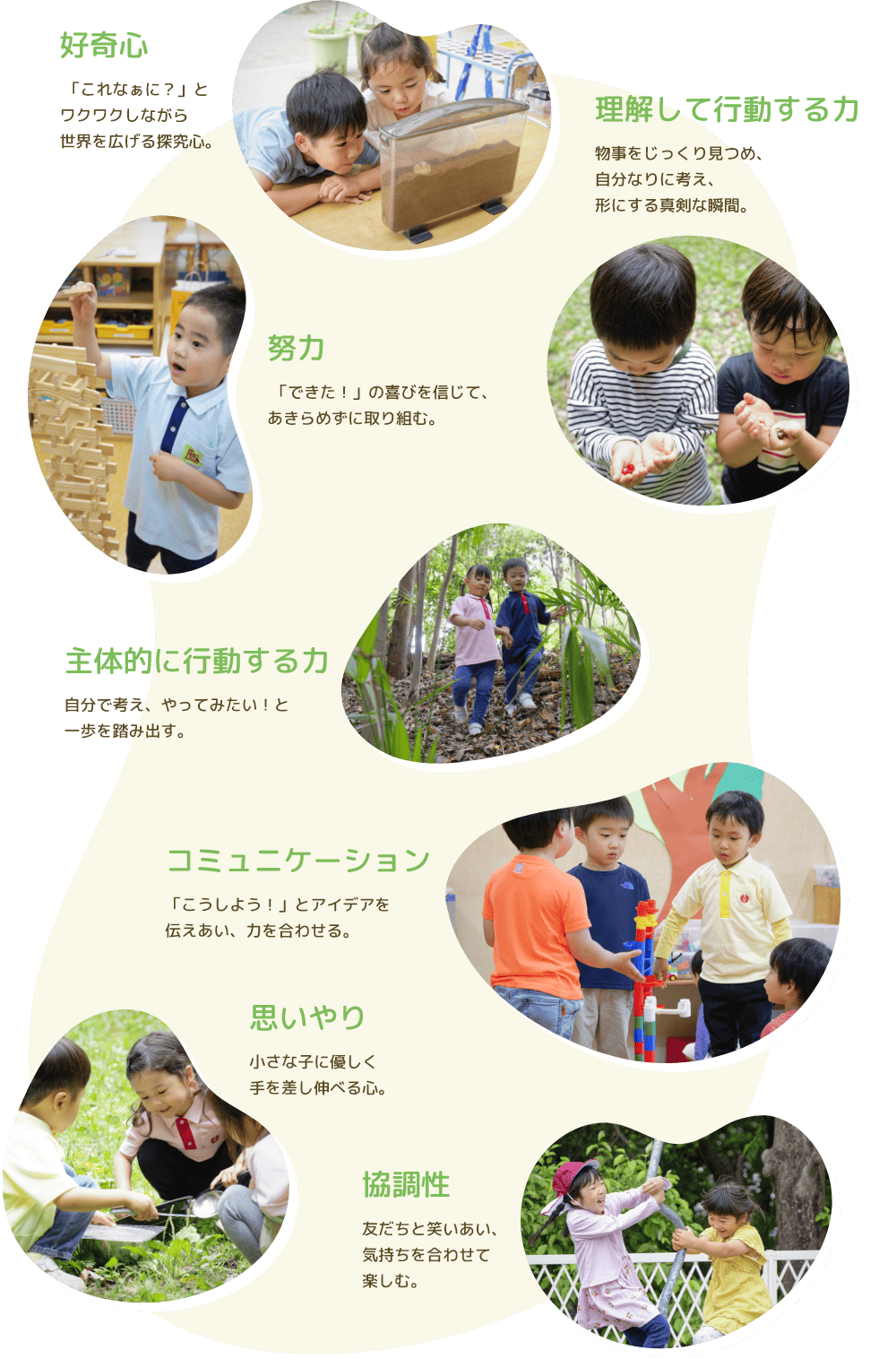 教科書のない、教科を横断的に学ぶことのできる幼児期の”あそび”の中にこそ、子どもたちが社会を生きるための大切な力を身につけていく瞬間がたくさんあります。非認知能力と呼ばれる“見えにくいけれどとても大切な力”は、日々のあそびの中に溢れているのです。