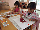 桜組さんは、今日はおいもの絵を描きました。おいもほりに行く予定だった畑で収穫したおいもを見ながら、クレヨンと絵の具を使って描きました。まずは、机に置かれた形や大きさが違うおいもを見て、どのおいもを描きたいかを自分で決めて座ります。次に、クレヨンでおいもの形を描き、おいもの表面の様子を(穴や細い根っこ、色の違うところなど)描き足します。最後に、絵の具を使っておいも全体に色を塗りました。おいもを良く見て観察し、それぞれ表現豊かな作品になりました。