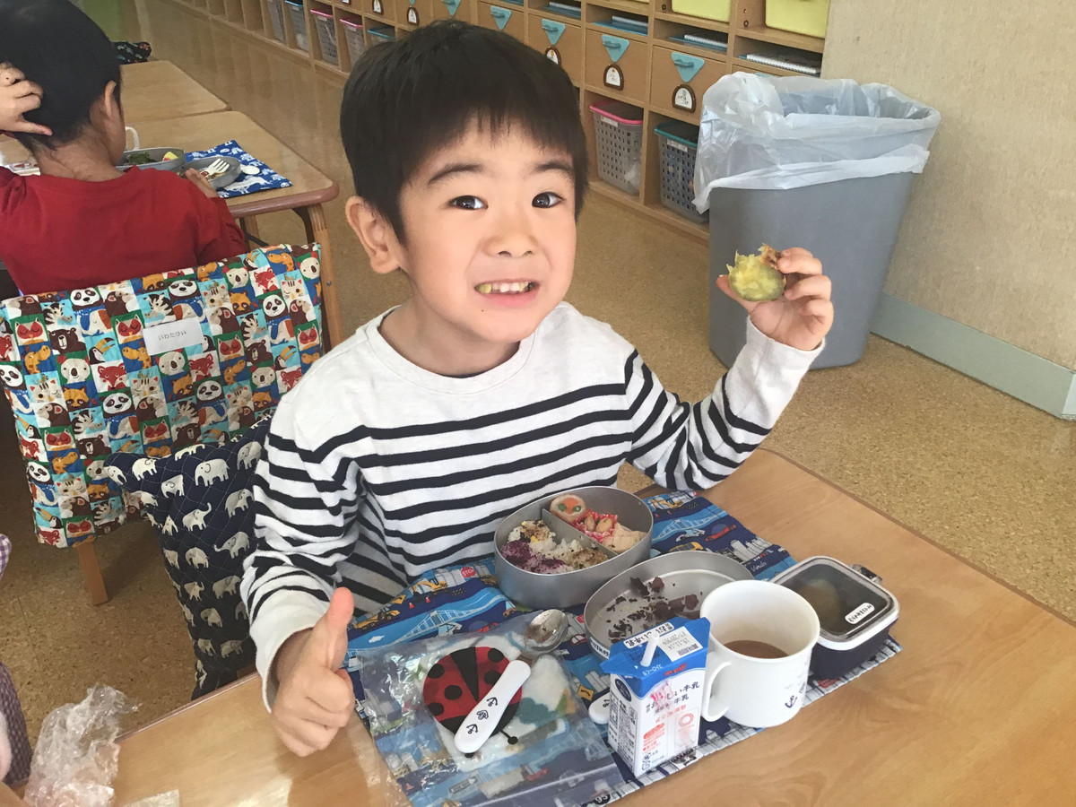 入園考査明けの今日、子どもたちは4日ぶりの登園。この秋一番の冷え込みになりましたが、こんな日は、「やきいも」日和!先日収穫したおいもをみんなで「やきいも」にしていただきました。