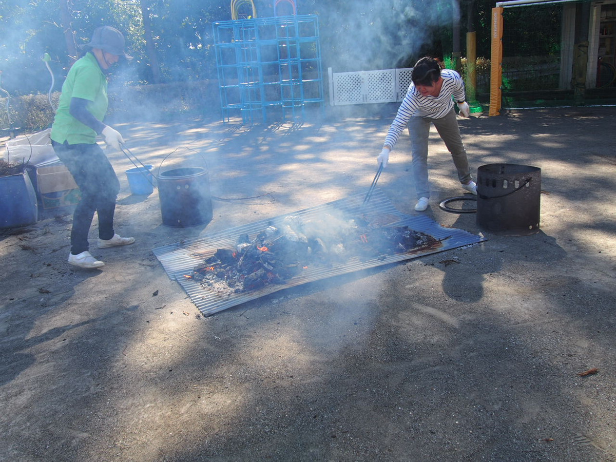 子どもたちは、それぞれのクラスで、おいもをきれいに洗い、新聞紙でくるんで水にぬらし、最後にアルミホイルでしっかりと包みました。おいもの準備と並行して、教員が、藤組さんが先週たくさん集めておいてくれた杉の枯れ枝を使って火を起こし、薪をどんどんとたき、おいもを焼くための準備をしました。火を燃やしている間に、藤組、菊組の子どもたちが、杉の枯れ枝の役目や、薪の役割、火が燃える様子やその音などについて、先生の話を聞きながら見学しました。火が落ち着いたところで、子どもが準備したおいもを投入。30分くらいして、おいもが焼きあがりました。桜組さんもテラスに出てきて、焼きたてのおいもを見て、においをかいでみたりしました。薪で焼いたおいもは格別のお味。お弁当の時間にみんなで味わっていただきました。