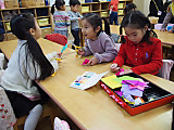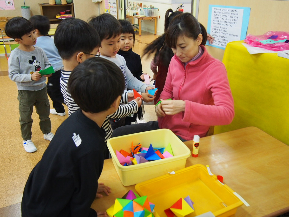 | 菊組さんです。折り紙が人気です。 | 「ハートつきの紙飛行機!」と見せてくれました。 | 前日、みんなで折った折り紙をつなげてくす玉に! |