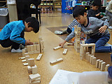 | 藤組さんです。「くみくみスロープ」はいつも人気。 | お絵描きや、点つなぎ、迷路など。 | ドミノたおしに挑戦! |