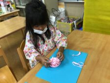 初日の今日は、みんなで「お店」を作ることにし、みんなで決めた「ケーキ屋さん」と「おもちゃ屋さん」に分かれて、品物作りをしました。