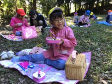 先週の金曜日は、とても気持ちの良い秋晴れの中、 藤組の子どもたちはミニグラウンドへ遊びに行きました。 10月はハロウィンデパートの準備に大忙しだったので、久しぶりの森あそび! 子どもたちは、広いミニグラウンドを駆け回り楽しく遊んでいました。 そして、子どもたちからお弁当もミニグラウンドで食べたい!という声があがり、ミニグラウンドでピクニックごっこを楽しみました。 写真で様子をご紹介します。 最後に先月のハロウィンデパートの集合写真も紹介します。