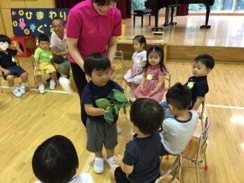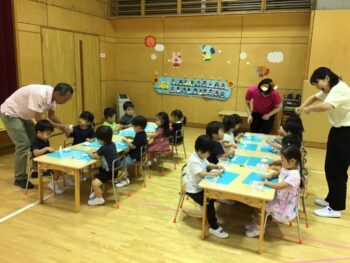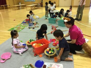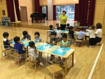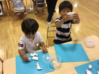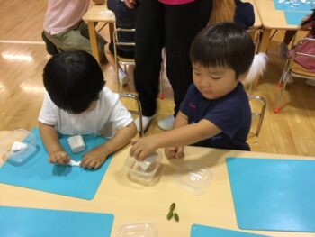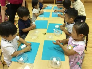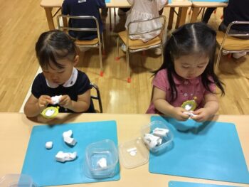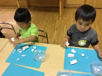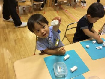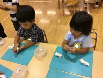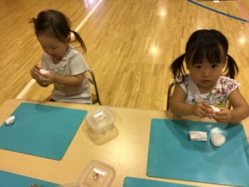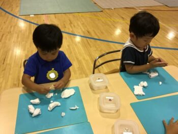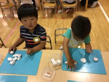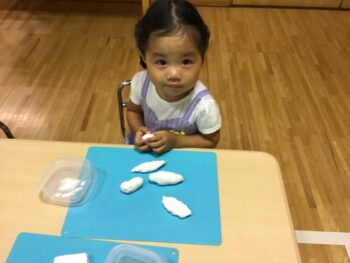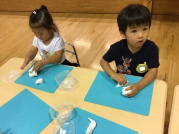 2学期のひまわり組は、いよいよ親子分離が始まりました。初回は、おもちゃで遊んだ後、粘土をして過ごしました。子どもたちは、名前を呼ぶとお返事をしてくれたり、自分たちでお片付けをしてくれたり、とても頑張ってくれていました。今はまだ寂しくなって涙が出てしまうお友だちも少しずつ慣れていってくれると思います。「ママやパパがいなくても幼稚園に行きたい!」と思ってもらえるよう、楽しいことを沢山企画していきますね。 (粘土あそび)
