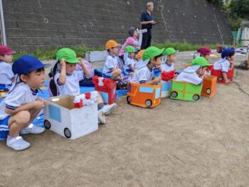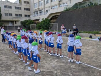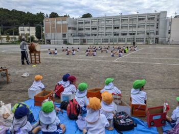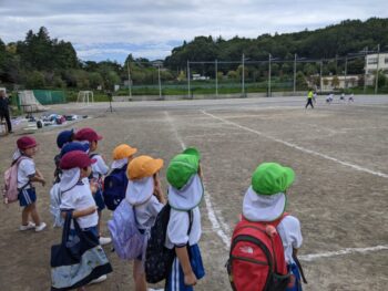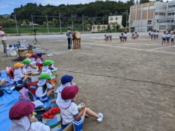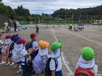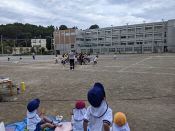 グラウンドでの予行練習で、年長さんの活躍する姿を目の当たりにした年少の子どもたち。