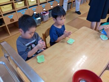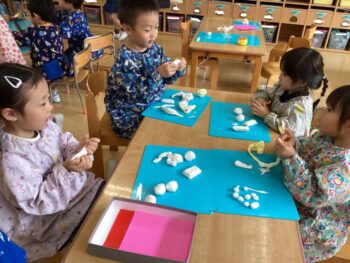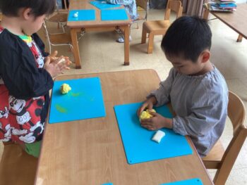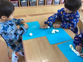 「いい匂いする!」「美味しそう」「柔らかいね」「昨日の粘土みたいだね」と呟きながら丸めました。