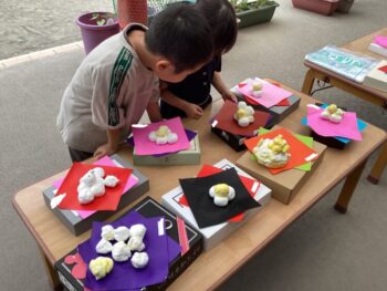 「お月見」の時には、お団子をお供えする習慣があることを子どもたちに伝え、紙粘土でお団子を作りました。