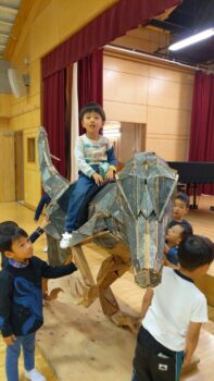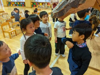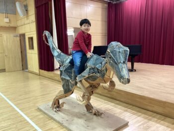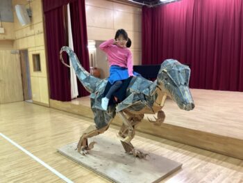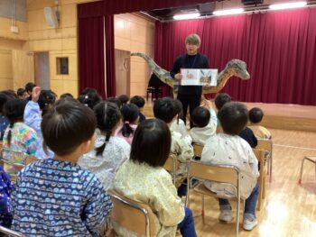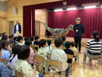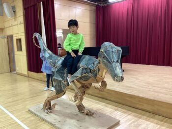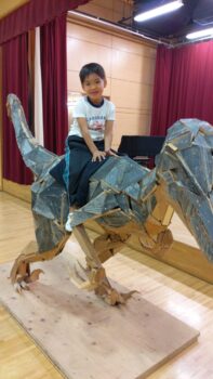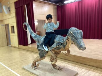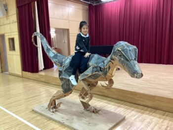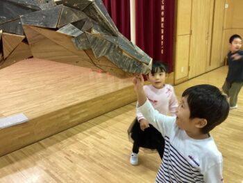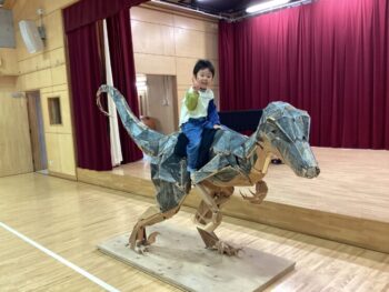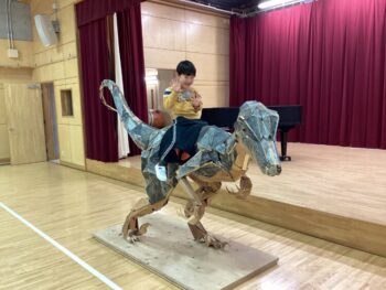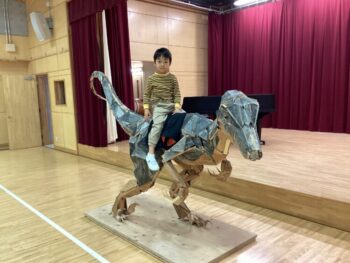 年少桜組は、恐竜に触れたり、乗ったり、作られ方に関心を持ち、顔の中や足の組み立て方を真剣に観察している子もいました。恐竜に詳しい子が「ヴェロキラプトルでしょ?」と加治さんに質問する場面も。