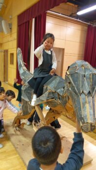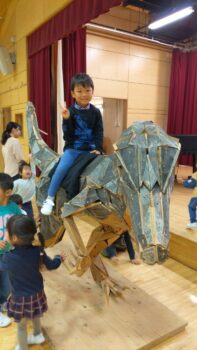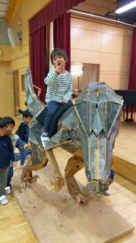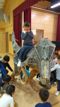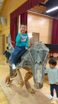 今年度は木の廃材アーティストの加治聖哉さんにお越しいただきました。使われなくなった木材を使って作った作品(乗れる作品!)を持ってきてくださいました。廃材の色もそのまま活用しているとのことでした。