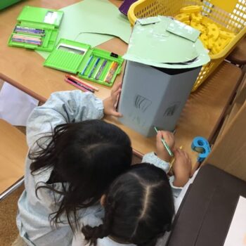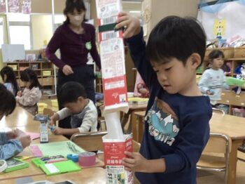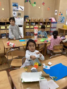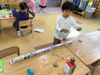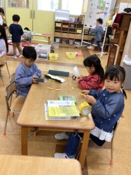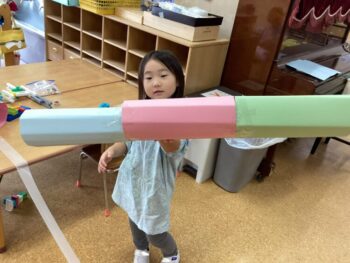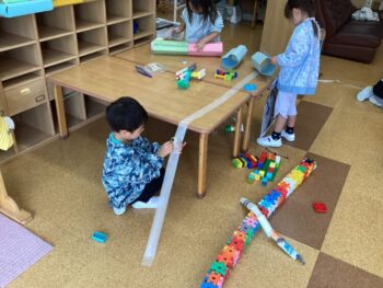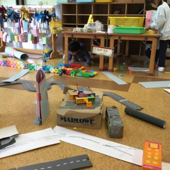 建物チームは女の子が多く、チームで相談する中で「プリキュアのかわいい街がいいな」と張り切っている様子でした。お家や犬小屋、プールなども作ったりしていました。お家を作った子たちは「自分のお家!」「黄色いテープを貼って電気がついているようにしているの。」とよく考えていました。また、「これが足りないんだよ」と道路チームから建物チームに飛行場を作るよう依頼もあったようで、お互い頼り合う姿にも感心しました。建物がふらふらして立たない時に、どうしたらしっかり立つのか試行錯誤する姿も見られました。