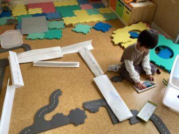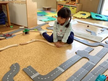 道路チームは、最初はいつも通り道路や車、汽車のおもちゃで街を作っていました。途中から「道が足りないね。」「僕電車を作ろうかな?」とそれぞれがよく考えて作っていました。