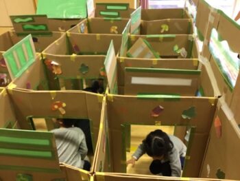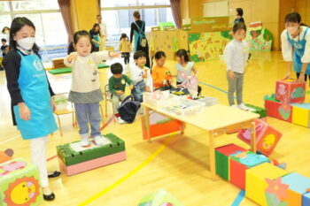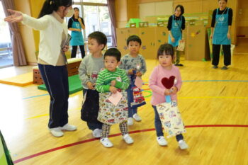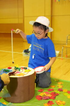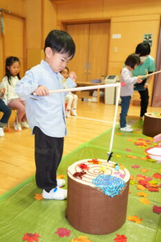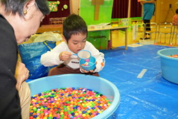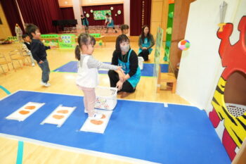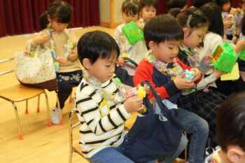 幼稚園の広いホールいっぱいに、「鬼たいじ」「スーパーボールすくい」「迷路」「サイコロ」「宝つり」といったお楽しみコーナーがあり、子ども達は目をキラキラと輝かせながら夢中になって楽しみました。最後に園長先生からキャンディレイをいただき、とっても嬉しそうな子ども達でした。