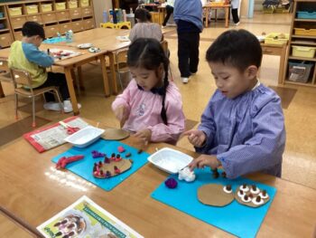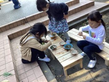 学園には色々な種類のどんぐりが沢山落ちています。小さい組のお友だちは、落ちているどんぐりを夢中で拾いますが、年長組さんは上を見上げ、どの木からどんぐりが落ちてくるのかということにも興味を持ちました。拾ってきたどんぐりを使い、思い思いに工作を楽しんだり、おままごとに使ったり、森村っこはどんぐりが大好きです。