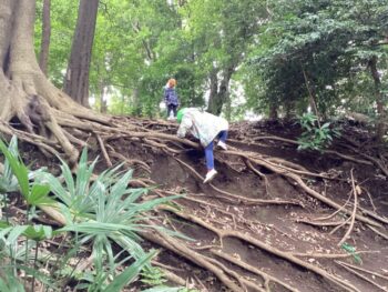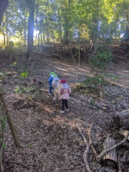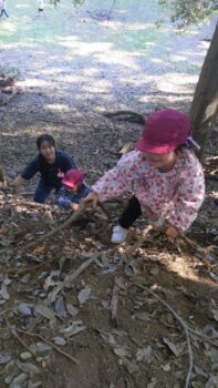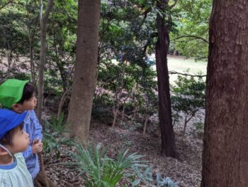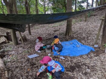 一本のロープで電車ごっこを楽しんだり、ホテルごっこやお店ごっこも盛り上がりました。男の子たちは木に穴を見つけ、「キツツキが空けたんじゃない?」と、しばらくじっと木を見つめていました。日差しが暖かい日は、森でお昼も食べ、みんなで森で過ごすことを楽しみました。