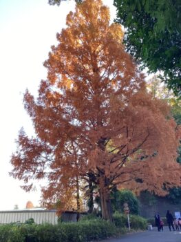 森村学園幼稚園と初等部の分岐点に大きなメタセコイアの木があります。メタセコイアの花言葉は「平和」と「楽しい思い出」です。まさに、森村っこがお友だちと共に過ごす学び舎にピッタリです。夏には緑の葉が茂っていたメタセコイアの木。秋になり少しずつ寒くなるにつれて徐々に葉が黄色くなり、そして今では美しいオレンジ色になりました。