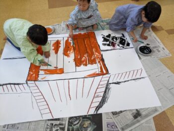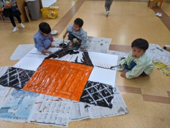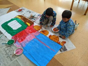 筆やお皿を洗って乾かしたり、床についた絵の具を一緒にお掃除したり。。。