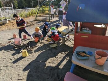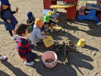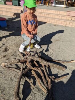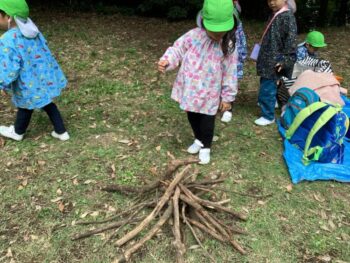森あそびの時間、子どもたちは自然と“キャンプごっこ”を始めました。