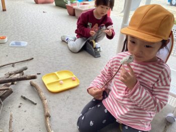 枝に紙を巻いてセロテープでつけ、“焼けたマシュマロ”を楽しむ姿も見られるようになりました。