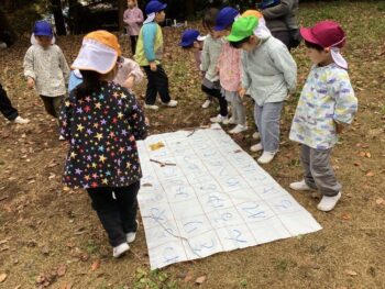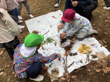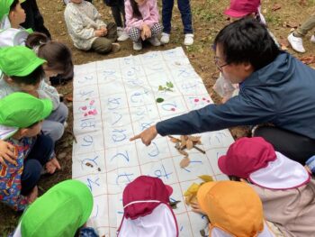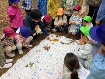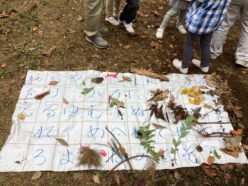 二つ目は言葉集め。ひらがな表を用いて森にある物で言葉集めに取り組みました。「はっぱ」を見つけたら「は」のマスに置きます。同じ葉っぱでも、「黄色の葉っぱ」として「き」に置いたり、「まるい葉っぱ」として「ま」に置いたり。一生懸命に森の中で言葉を夢中になって探しました。