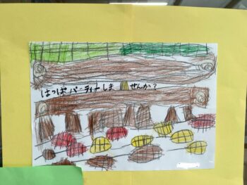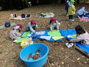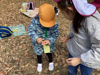 今回の森あそびのテーマは、「葉っぱパーティーをしよう!」と「もりむらだんちの生き物が住む木を探そう!」でした。園庭で落ち葉で遊んだのが楽しかったため、「葉っぱパーティーをしたいからみんなを誘うね。」とポスターを描いてくれた子がいたので、森でも葉っぱで工作をしたり、落ち葉で遊んだりしました。