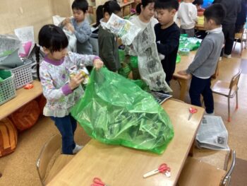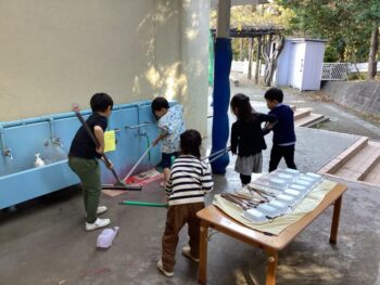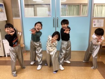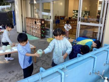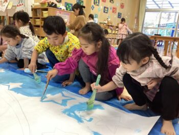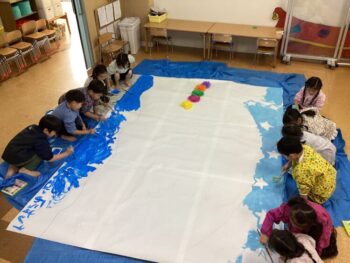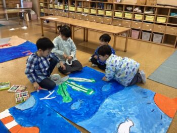 今回は全て海の世界のお話のため、同じ海の生き物でもそれぞれの役と分かる背景を考えることに苦戦しながらも、図鑑や絵本を参考にしながら、それぞれの役らしさを相談し、表現しました。劇だけではなく、背景にもご注目ください。ナレーター役と子どもたち役には最後の大きな背景製作をお願いしました!劇の終盤、みんなが笑顔になった後に見える世界とは?というテーマで考えて製作しています。ダイナミックな絵の具の活動の後には、お友だちと力を合わせて、使った道具や絵の具で汚れたテラスを自主的にきれいにしようとする姿が見られました。