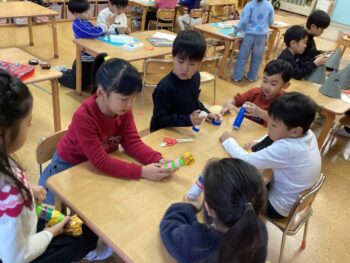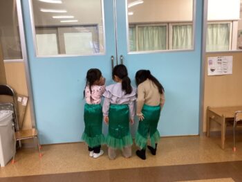「年長藤組クリスマス会に向けて①」のブログでは、『まほうのくつ』の劇の始まりについてお伝えしました。今回のブログでは、お話の構造についてや、舞台の背景作りやそれぞれの役の衣装作りについてお話したいと思います。