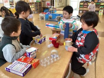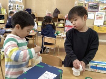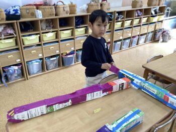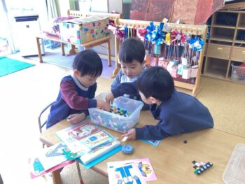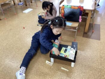 異年齢で関わりながら、ゆっくりとおままごと、LaQなどで遊んでいました。工作も指編みや箱を使用しての工作など、集中して遊んでいました。