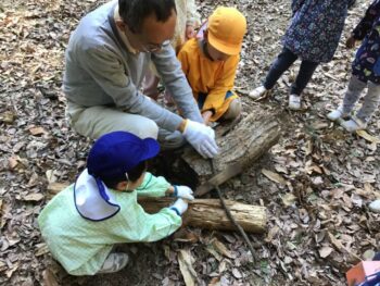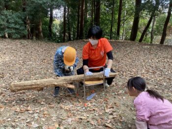子どもたちは、のこぎりを何度も使ううちに、どんな太さの木が切りやすいかを自分で考えるようになりました。力の掛け方が難しく、力を掛けすぎると切れないのですが、段々と加減が上手になってきました。教員は隣に座って見守り、1人で切れる子も出てきました。