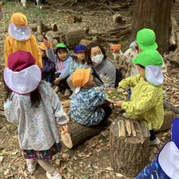 切った時に出る木屑の匂いや、木の断面の手触りなど色々なことを子どもたちが感じています。