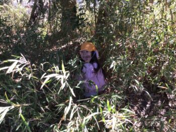 子どもたちとよく行くのはミニグラウンドですが、初等部の三年生がよく遊ぶ「三年の森」も人気です。迷路のような森です。かくれんぼをしている子もいました。