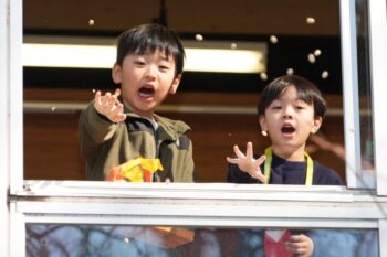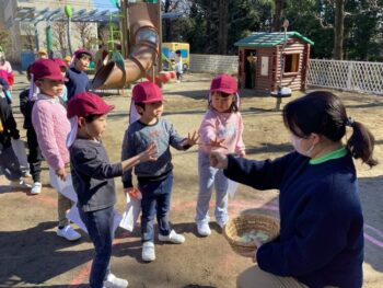 自分で作った豆箱に豆を入れ豆まきをしました。「お寝坊おに、おにはそと~!」「お野菜食べないおに、おにはそと~!」と、子どもたち一人ひとりが自分の苦手なことを鬼にたとえ、心の中から追いだすのが、森村流の豆まきです。
