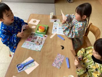 製作中、「♪あかりをつけましょ ぼんぼりに〜」と可愛らしい歌声が聞こえてきました。 歌を口ずさみながら楽しく作る子、全神経を集中させて黙々と取り組む子……。