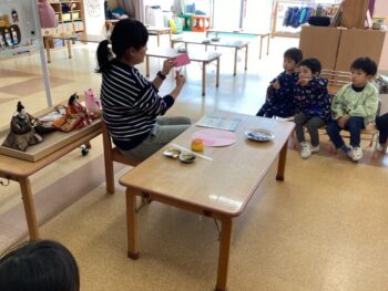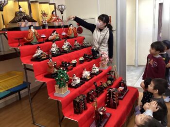 ひな祭りの文化についても学びました。 「お内裏様が頭にかぶっているのは『烏帽子(えぼし)』、手に持っているのは『尺(しゃく)』だよ」 「お雛様はキラキラの『冠(かんむり)』と、素敵な『扇(おうぎ)』を持っているね」