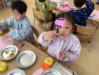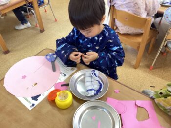 年少桜組では、3月のひな祭りに向けて「お雛様とお内裏様」の製作に取り組みました。 この製作は、年少組になってからこれまでに身につけてきた「たくさんのスキル」がぎゅっと詰まった、まさに1年間の集大成ともいえる活動なのです。