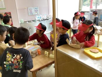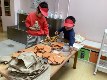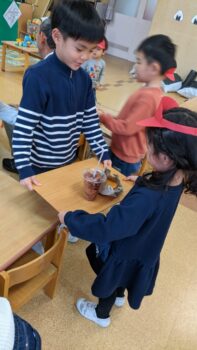 作った料理をふるまううちに、他のあそびをしている友だちにも声をかける姿が見られ、やりとりは次第に“お店”の形を帯びていきました。