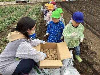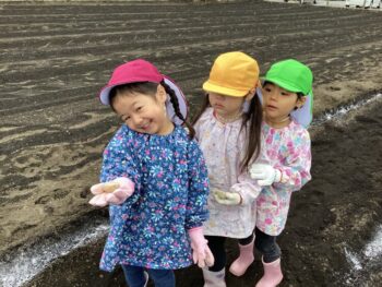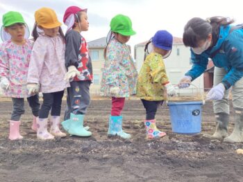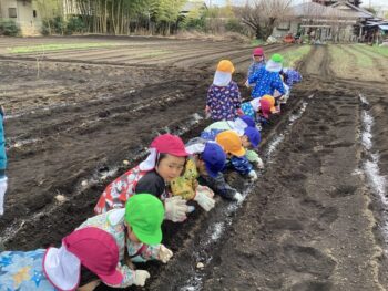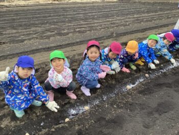 卒園児の保護者の方のご協力で、畑にジャガイモを植える体験をさせていただきました。