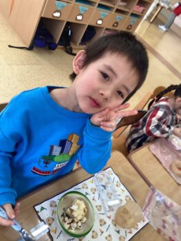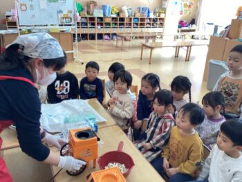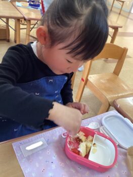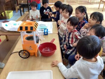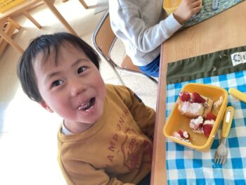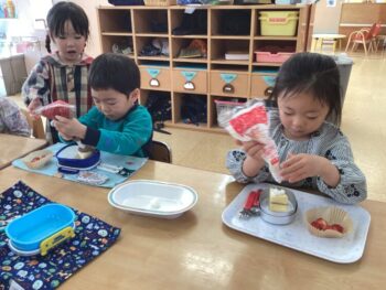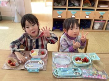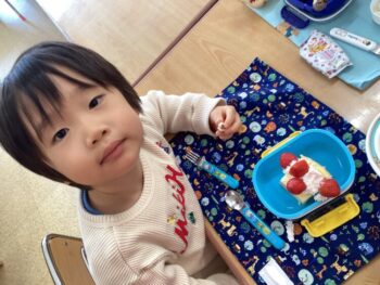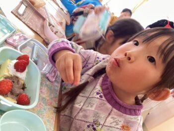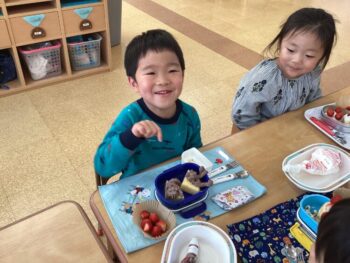 お弁当の歌を替え歌して、「ケーキとポップコーン嬉しいな〜おてても綺麗になりました〜みんな揃ってご挨拶♩」と歌いました。