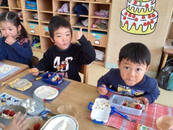 3つのホールケーキをみんなで分けて、ホイップクリームとイチゴでデコレーションをしました。