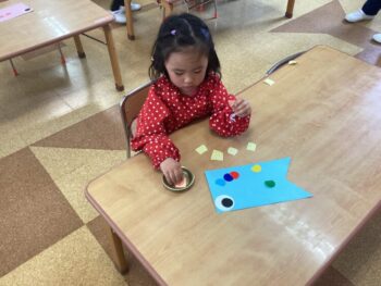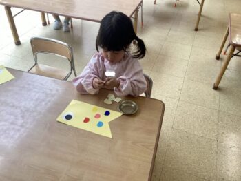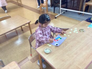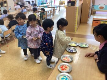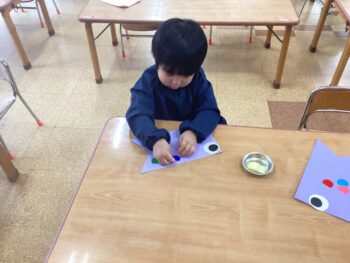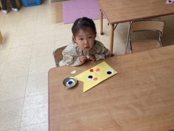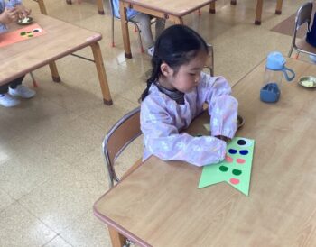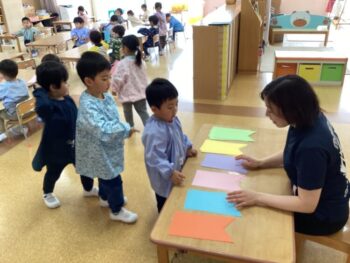 1日目は好きな色の鯉を選び、目玉をのりで貼りました。2日目は鱗をシールで貼り、飾り付けをしました。鱗は並べて貼ったり、同じ色にしたり、たくさん貼ったり、思い思いのこいのぼりの完成です!