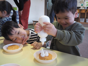 おやつには、ケーキデコレーションを楽しみ、ワイングラスで乾杯してパーティー気分。