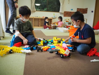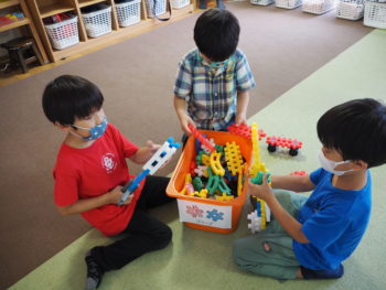 暑い日が続いていたり、お天気が不安定だったりで、なかなか外あそびができない日が続いていますが、子どもたちはお部屋の中でも、それぞれ好きなあそびを見つけて楽しんでいます。