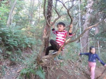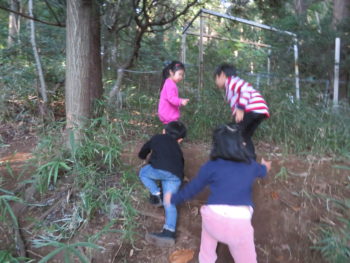 崖のぼり、木登り、泥んこコーヒー屋さん、棒投げゲーム、チョークでお絵かきなど、学年を越えて一緒に楽しむ姿がありました。