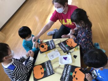 もう少しでHalloween !! ということで、今日はHalloween bag作りをしました。ハサミ、のり、クレヨンを使って、画用紙でJack-O’-LanternやGhostを作ったり、白い絵の具で手型をとったりしました。 Free play timeの様子です。 子どもの森ファミリー❤️